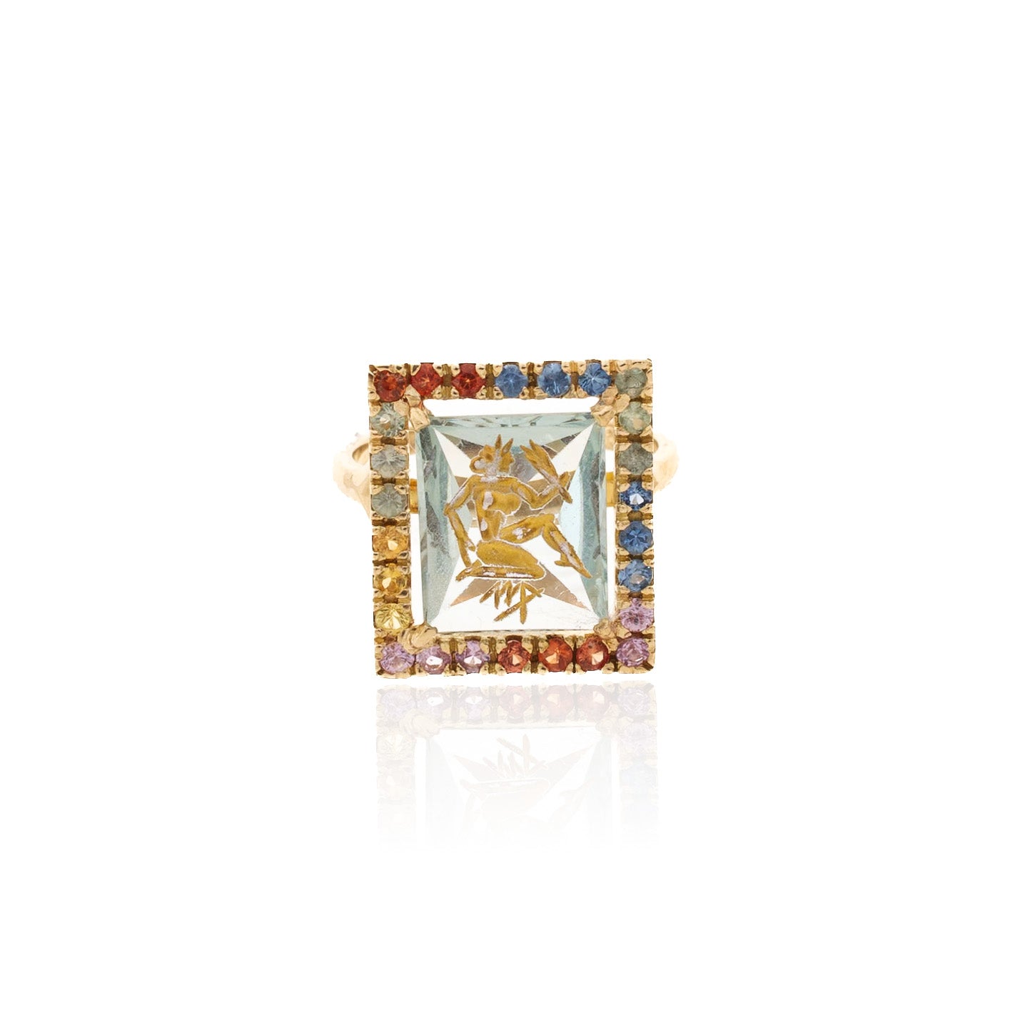 Anéis em ouro 18K com zircônia central pintada à mão e moldura de safiras coloridas. Cada signo ganha uma interpretação única — delicada, vibrante e cheia de personalidade.