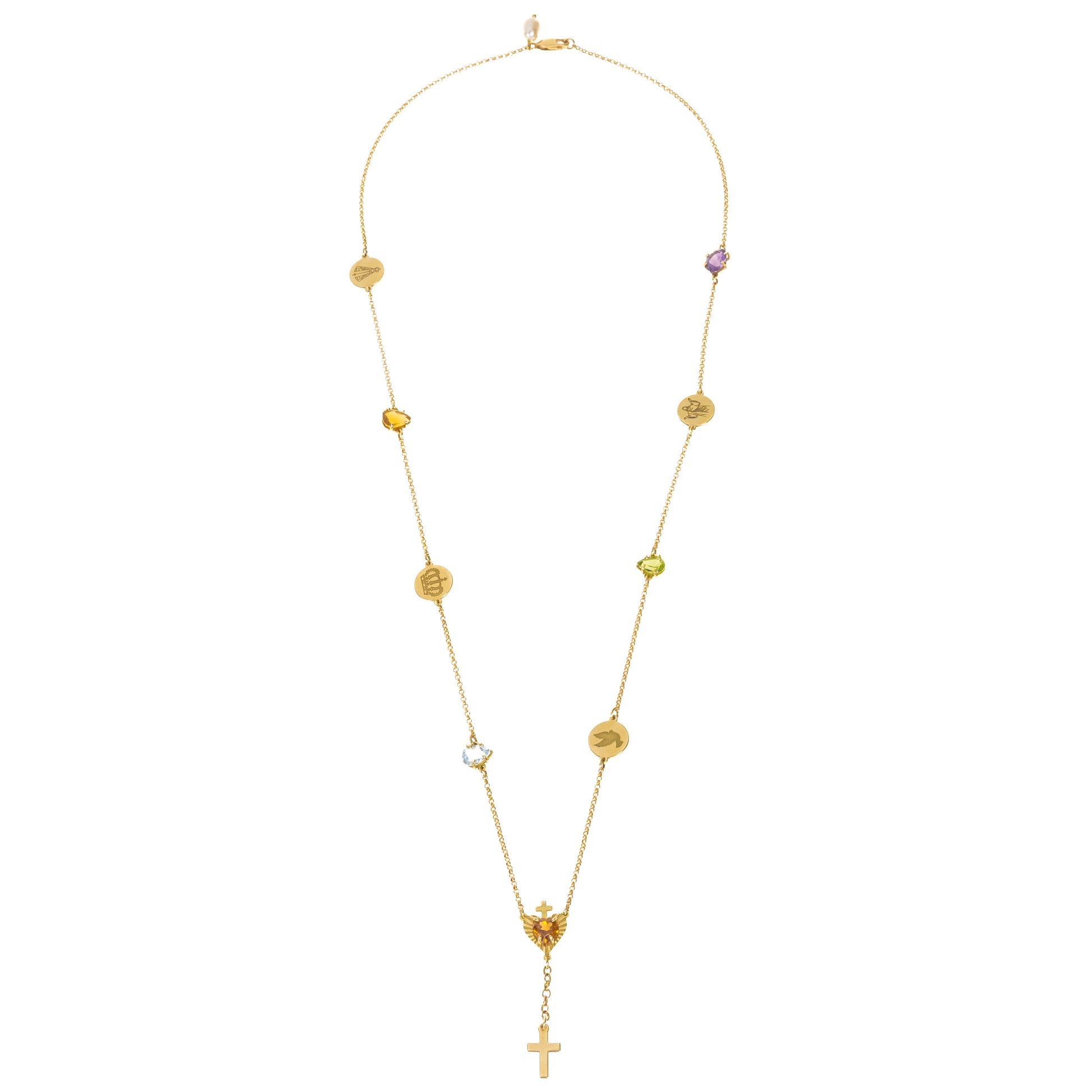 Fé que se carrega no peito. O colar terço com o Sagrado Coração traz a simbologia de devoção e força interior em uma peça sofisticada, com design delicado e atemporal. Um elo entre o divino e o cotidiano.