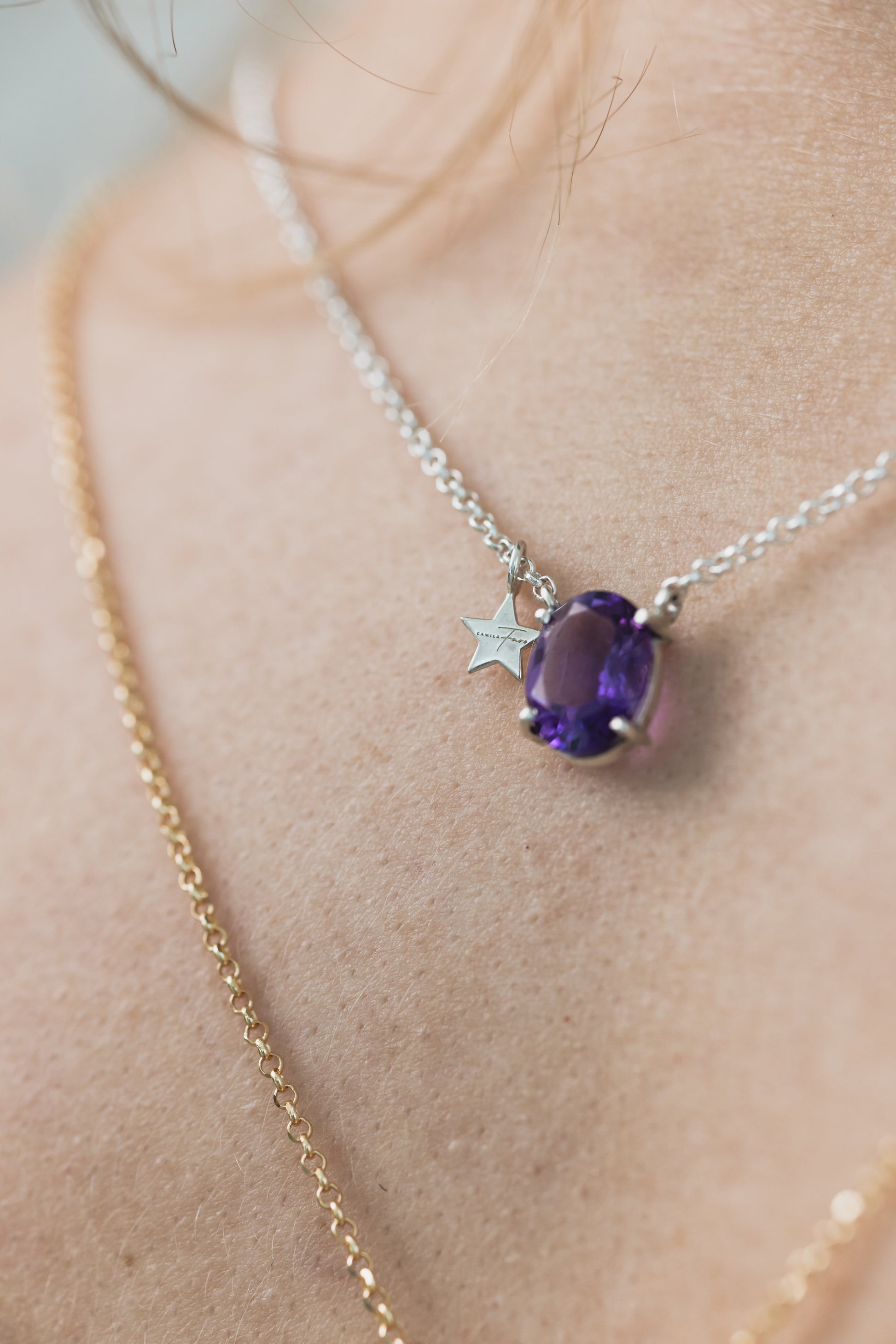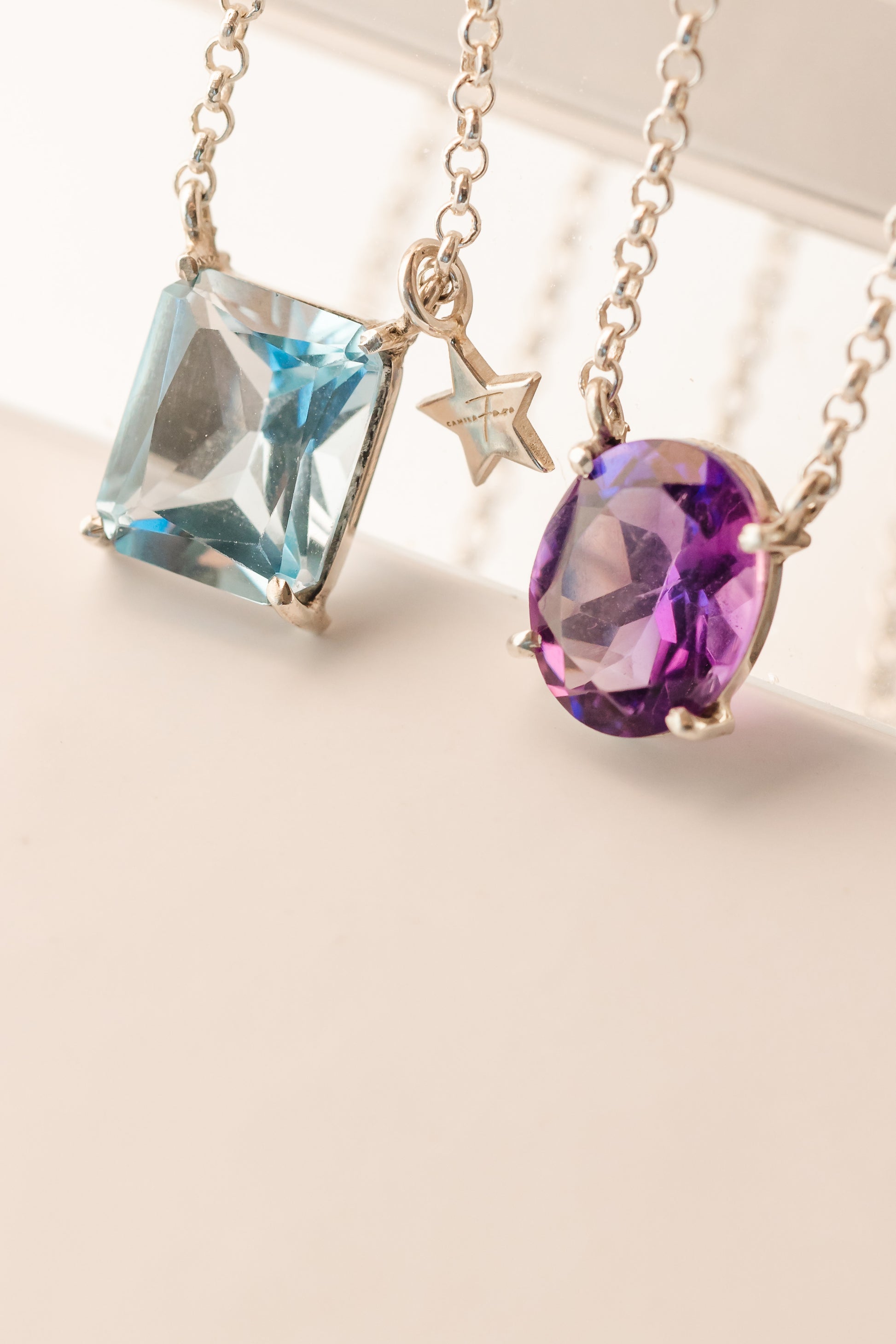 Em prata 925, com corrente elo português de 1,5mm e 60cm, o escapulário Abbraccio traz uma miniestrela móvel que percorre a corrente com leveza. Com as pedras ametista e topázio azul, a peça pode ser personalizada com outras gemas — um abraço precioso cheio de significado.